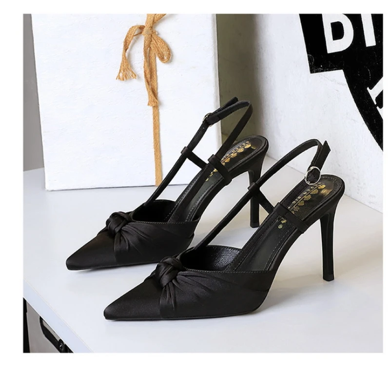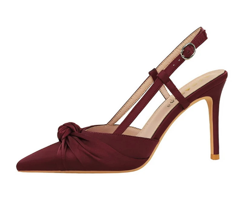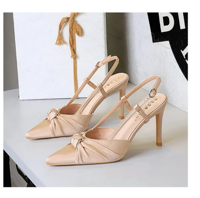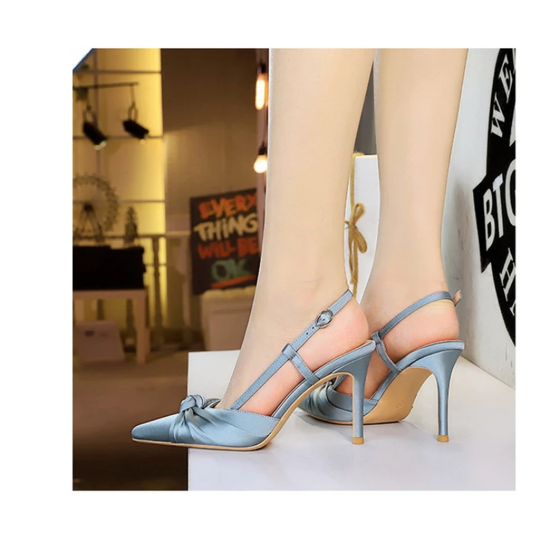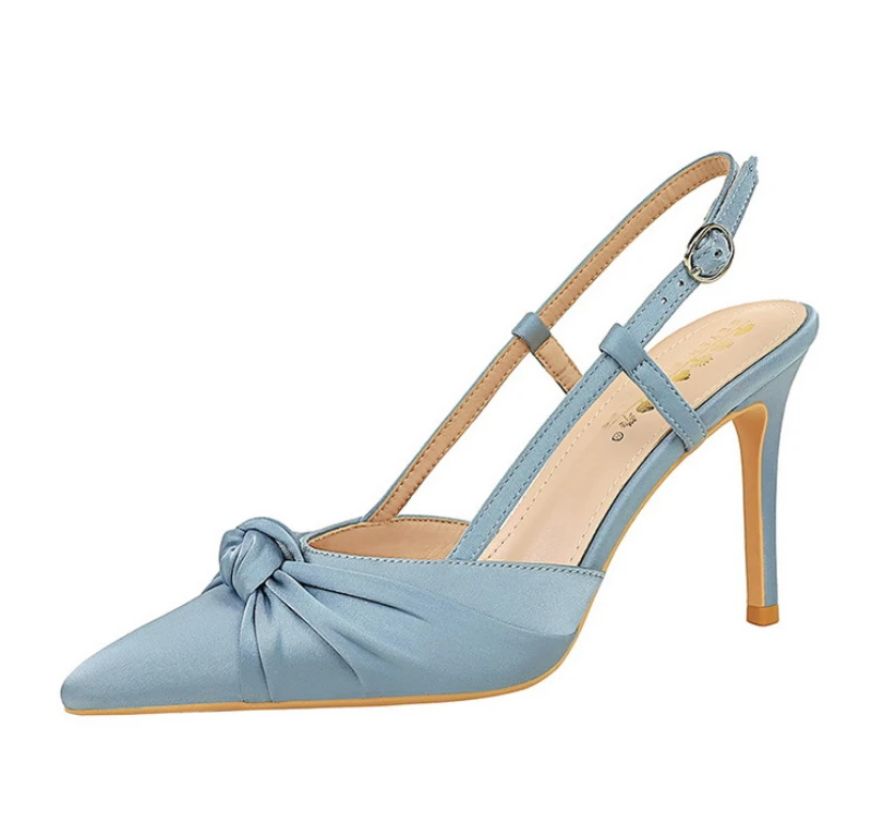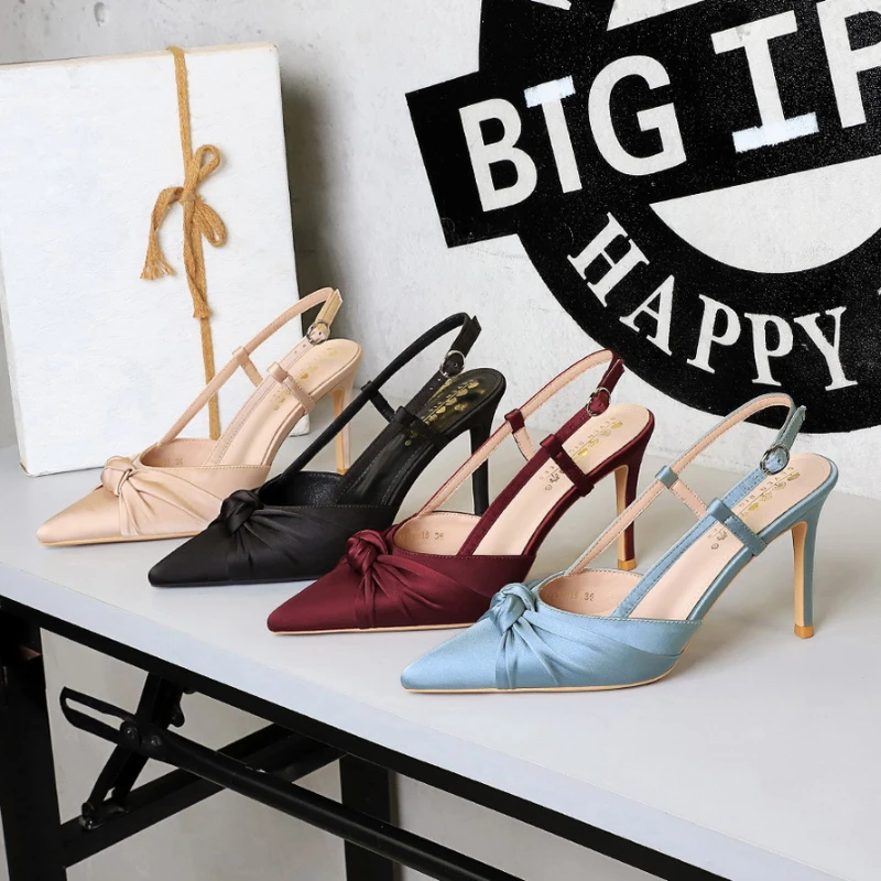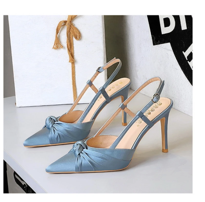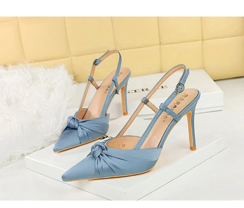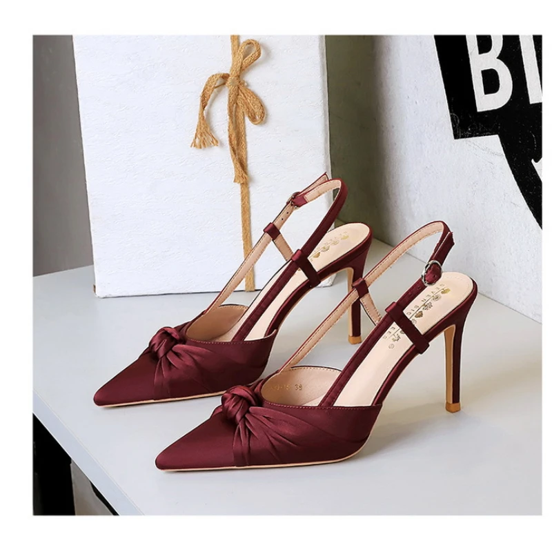 European And American Style Banquet Silk Bow Slim Heels High Heels Pointed Toe Shallow Mouth Back Empty Head Shallow Mouth