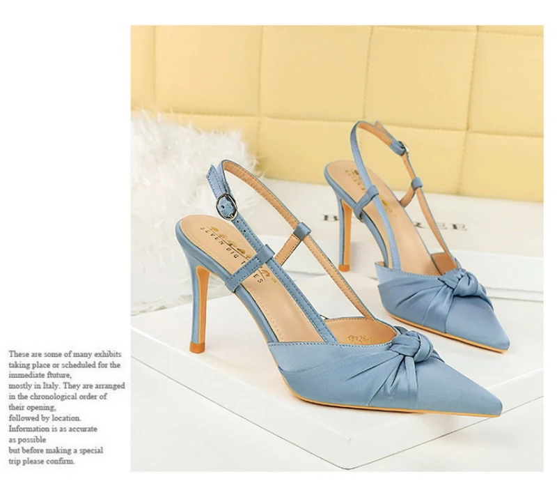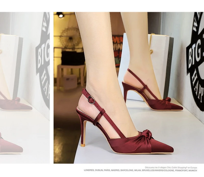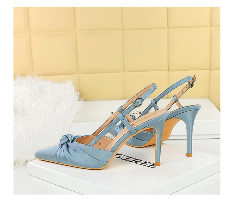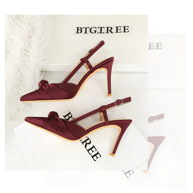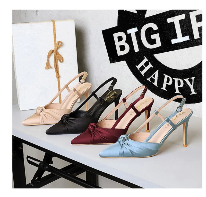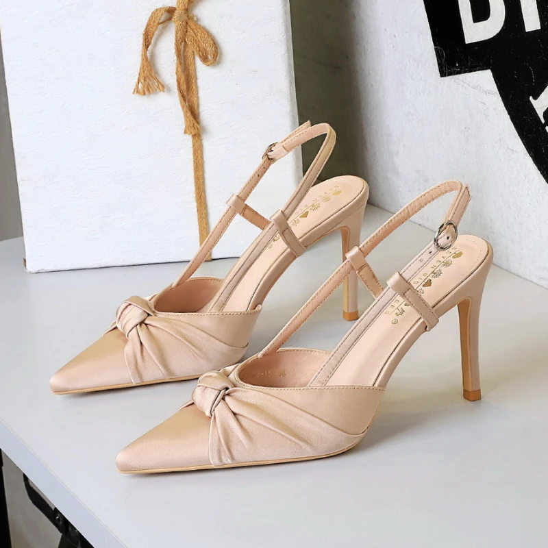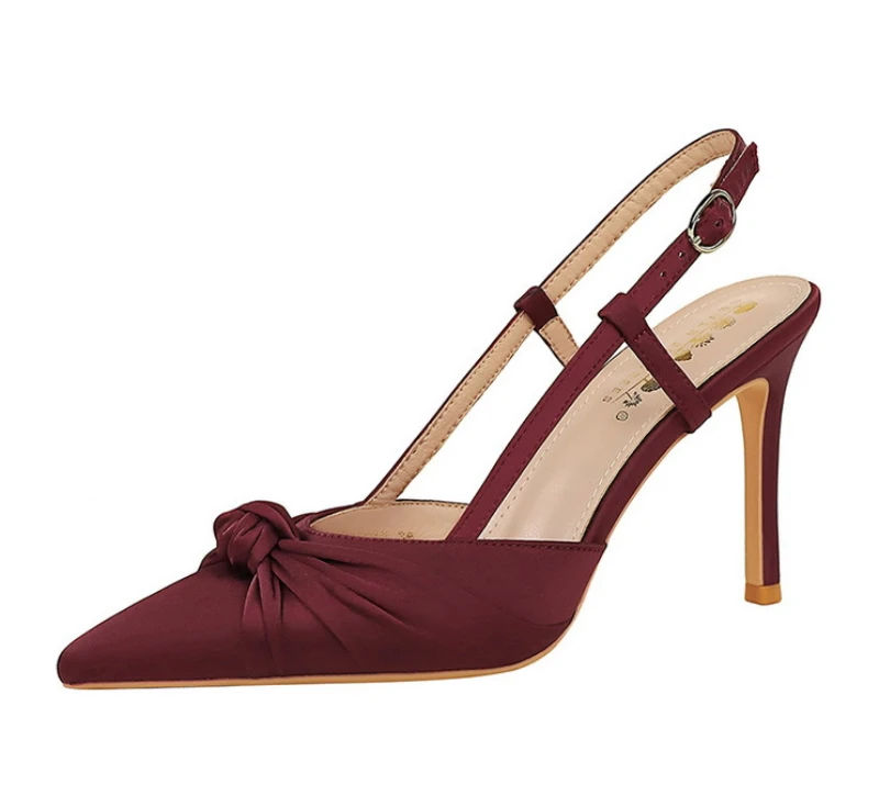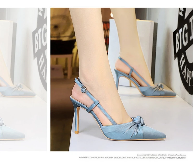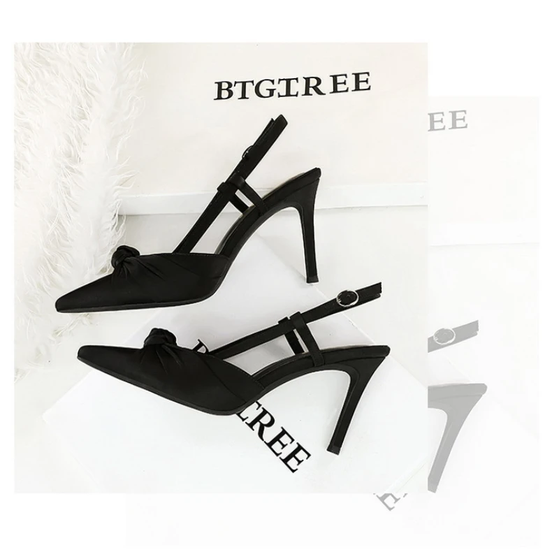 European And American Style Banquet Silk Bow Slim Heels High Heels Pointed Toe Shallow Mouth Back Empty Head Shallow Mouth