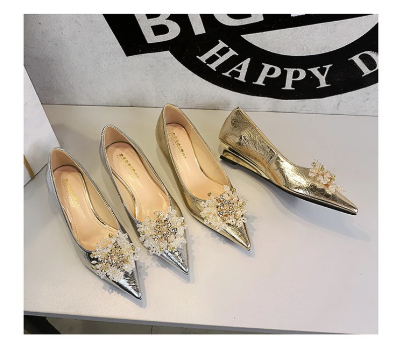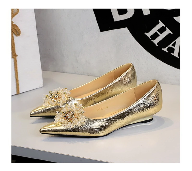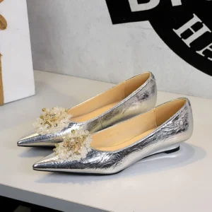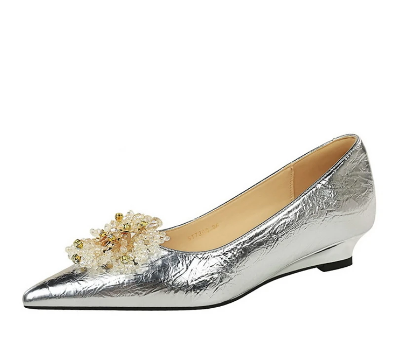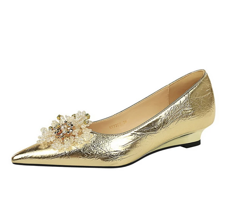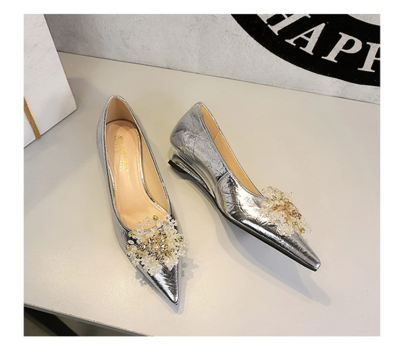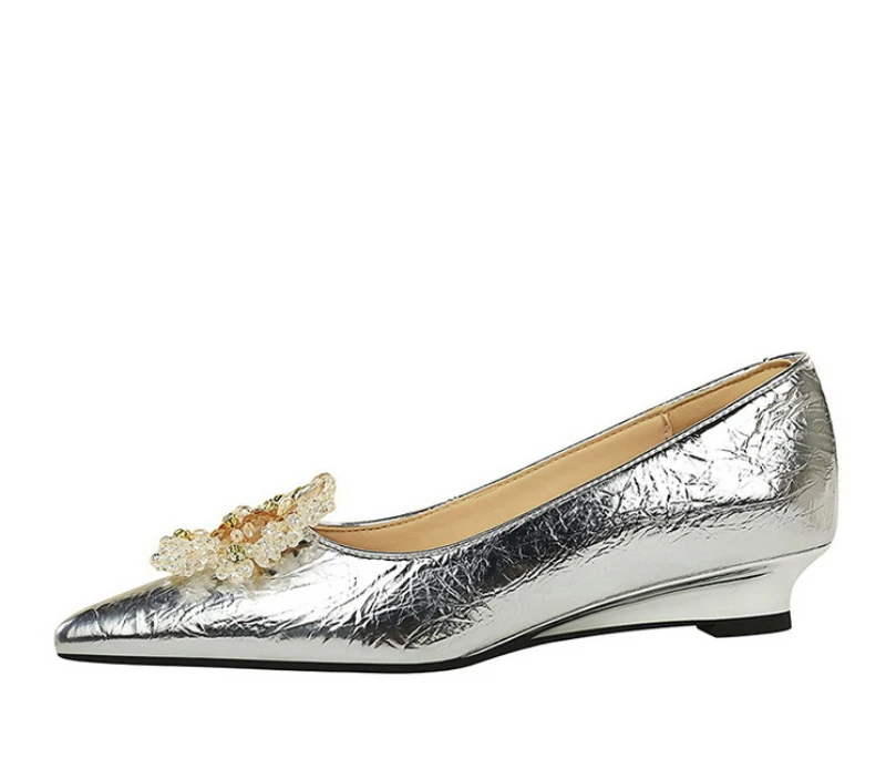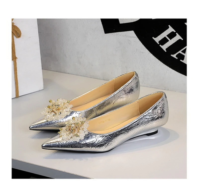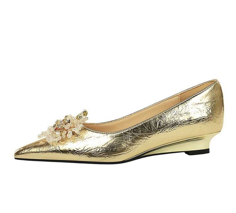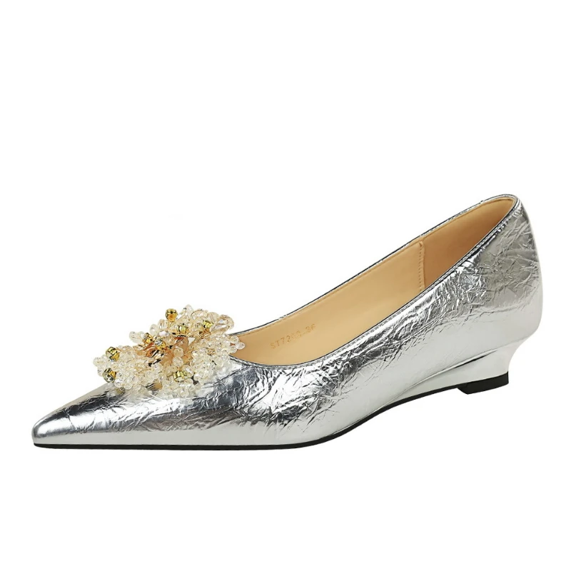 Korean Style Rhinestone Wedding Shoes Metal Hand-Grabbing Wedge Pattern Slim Women’s Shoes Pointed Toe Low Heel Women’s Shoes
