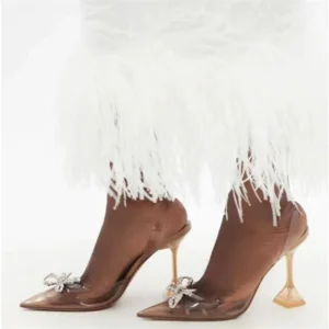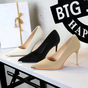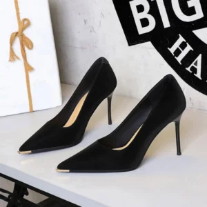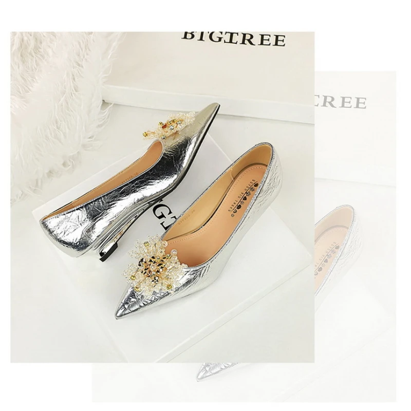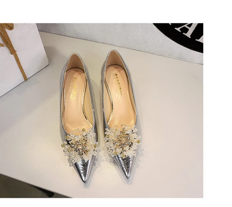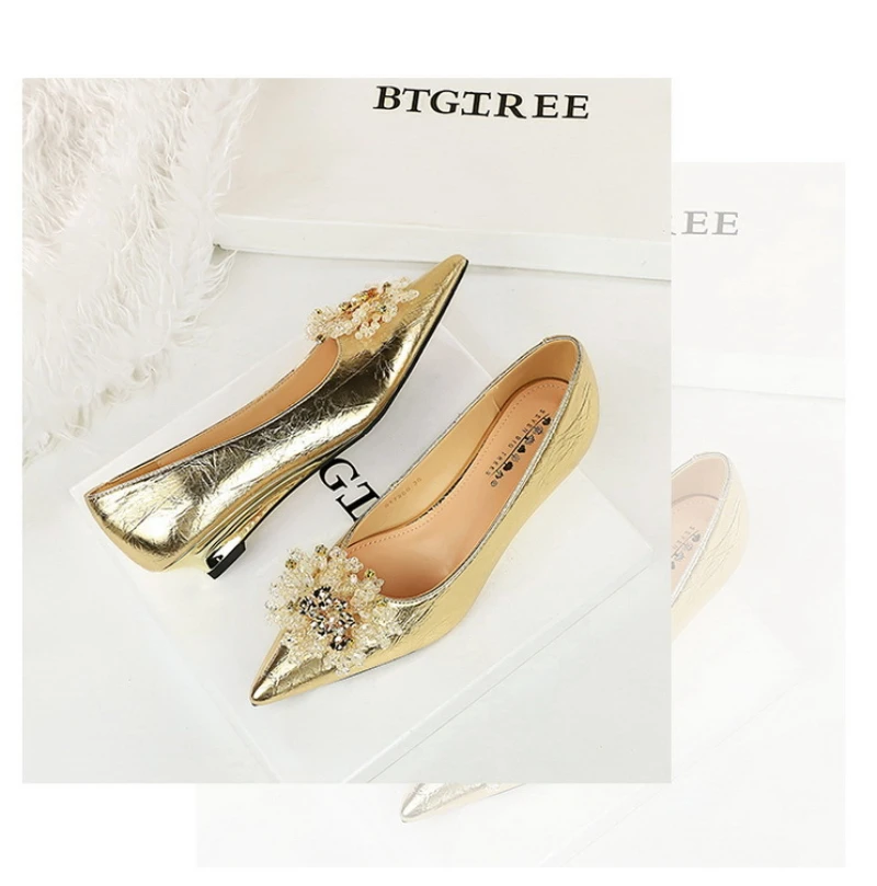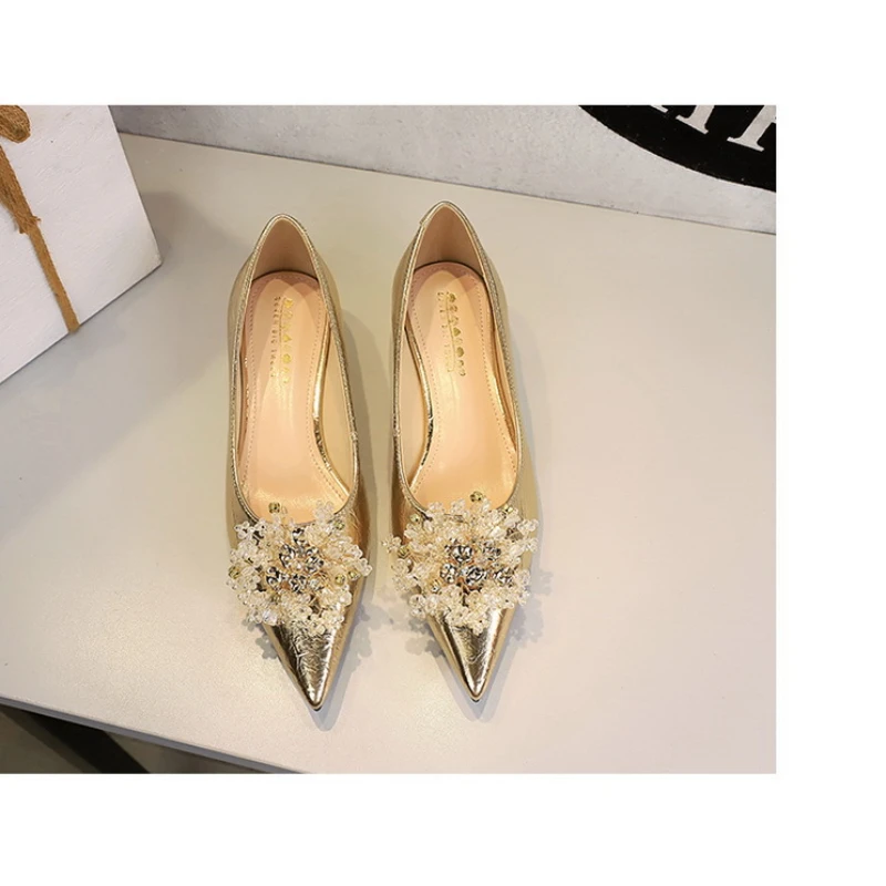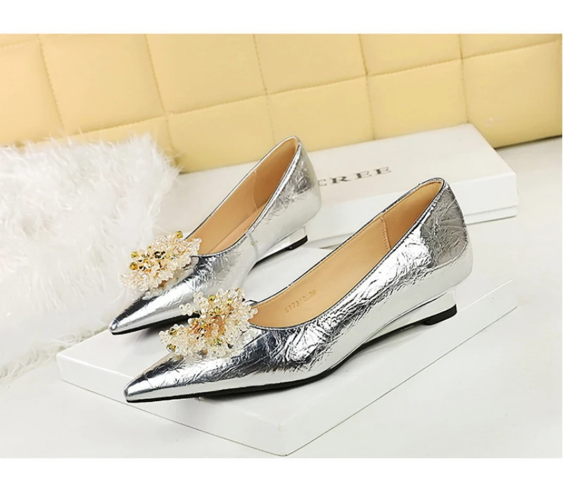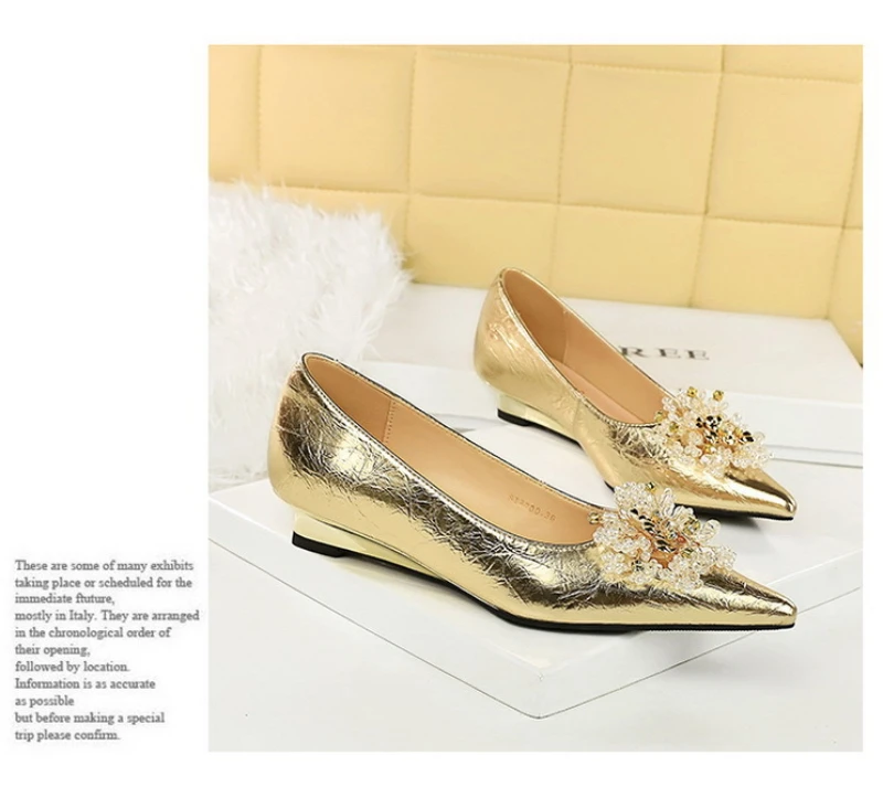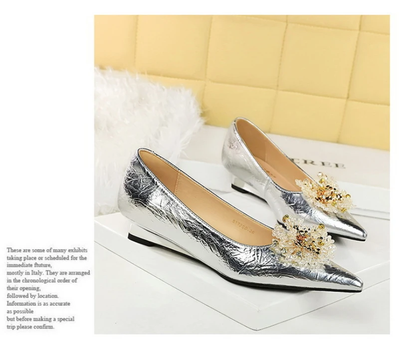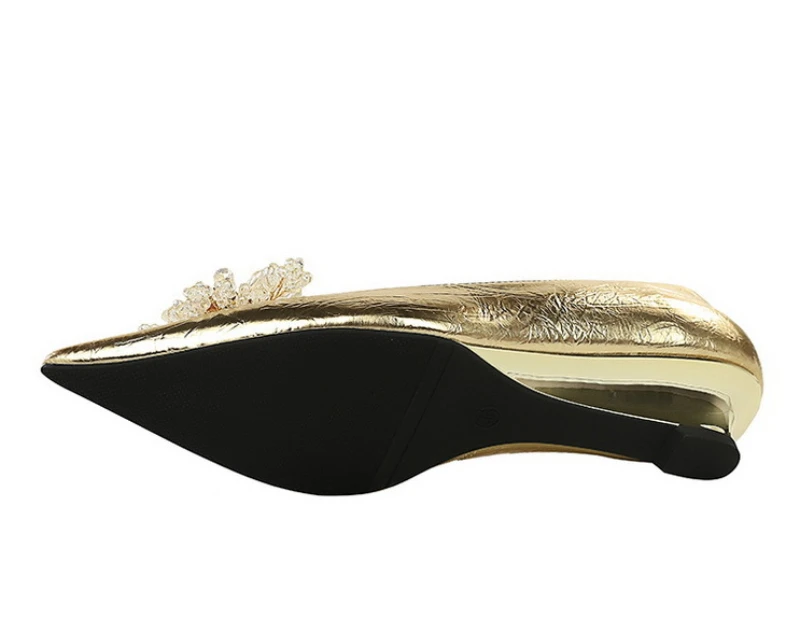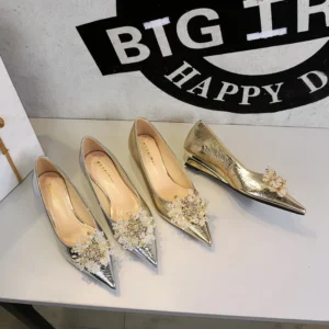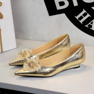 Korean Style Rhinestone Wedding Shoes Metal Hand-Grabbing Wedge Pattern Slim Women’s Shoes Pointed Toe Low Heel Women’s Shoes